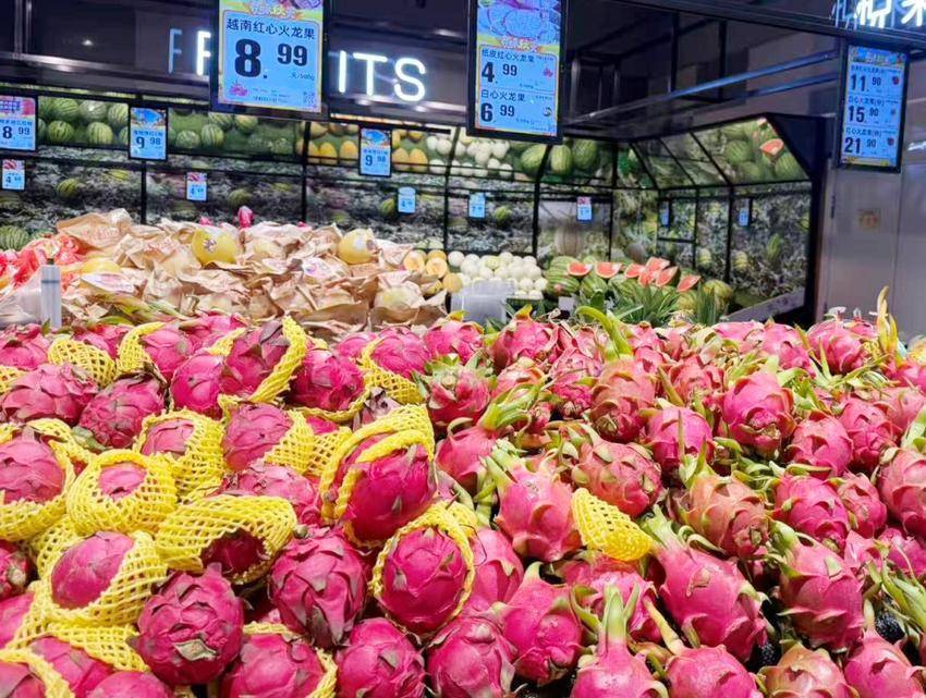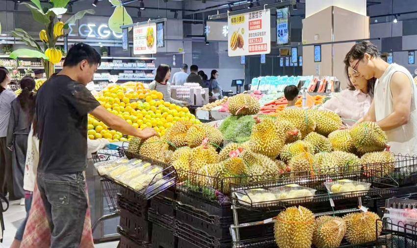 “现在上市的全是当季水果,蜜橘、柚子、冬枣、火龙果都有,蜜橘4块一斤,还有特价柚子9.9元一个,像这种活动款的榴莲都挺实惠的。”超市工作人员介绍,针对国庆中秋双节超长假期,目前,超市的水果储备充足,完全能满足市民的节日需求。