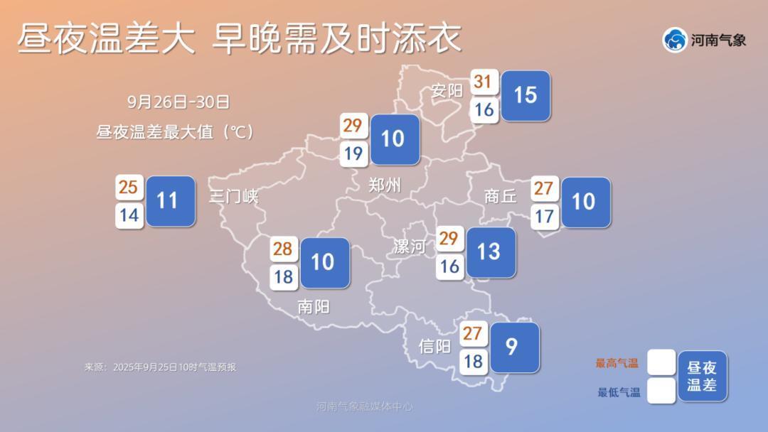 天气影响与提示1.当前我省秋作物已进入成熟收获期,近期仍多降水过程,秋作物已成熟地块需关注土壤持续偏湿对农机下地收获的影响,做好避雨收获,科学晾晒;已收获秋作物注意通风存储,确保颗粒归仓。2.地质条件脆弱地区需加强灾害隐患点巡查排险,防范持续降水可能引发的局地山洪、地质灾害、农田渍涝、城市积涝等气象风险。3.需关注降水对国庆交通出行、景区旅游等的影响。4.公众需密切关注天气变化趋势及属地气象台站发布的最新天气预报、气象灾害预警信号和气象风险提示,做好防范应对。昼夜温差增大,及时调整着装预计今后五天,我省最高气温相对平稳,基本稳定在25℃上下,最低气温15℃左右,昼夜温差逐渐增大,尤其是在30日,昼夜温差多地可超10℃。建议大家及时关注气温变化,适时调整着装,谨防感冒。